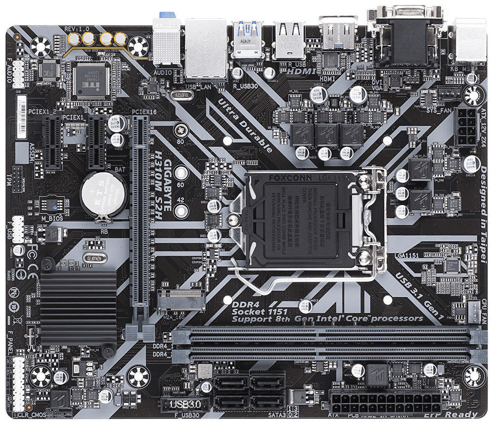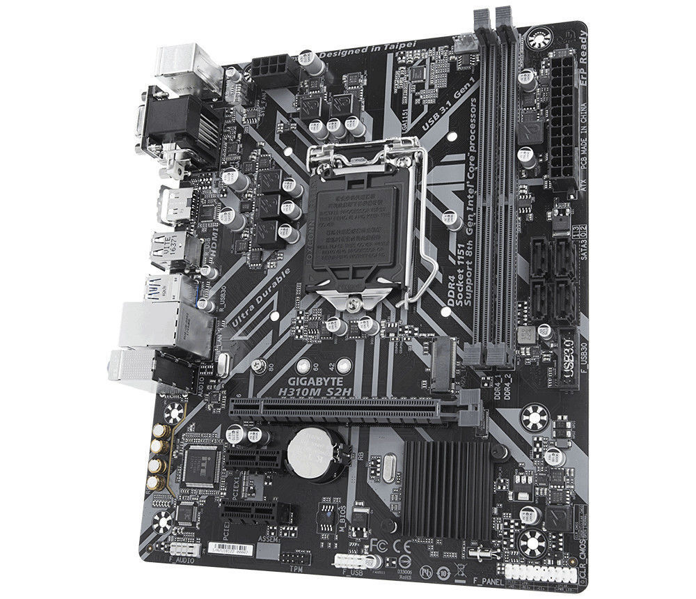 Gigabyte H310M S2H. Tipos de memórias suportadas: DDR4-SDRAM, Tipo de memória slots: DIMM. Fabricante do processador: Intel, Tomada de processador: LGA 1151 (Socket H4). Interfaces suportadas de armazenamento: M.2, Serial ATA III. Tipo de ethernet interface: Gigabit Ethernet. Família de chipset da placa-mãe: Intel, Motherboard chipset: Intel H310