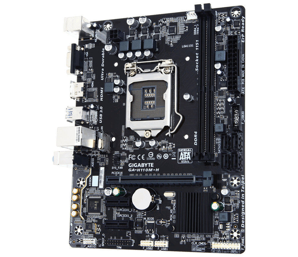 Gigabyte GA-H110M-H. Tipos de memórias suportadas: DDR4-SDRAM, Tipo de memória slots: DIMM. Família de processador: Intel, Tomada de processador: LGA 1151 (Socket H4). Interfaces suportadas de armazenamento: Serial ATA III. Tipo de ethernet interface: Gigabit Ethernet. Família de chipset da placa-mãe: Intel, Motherboard chipset: Intel H110